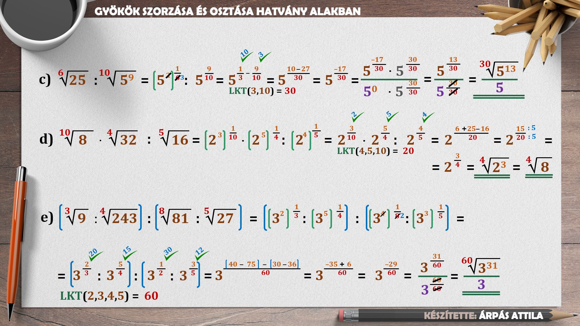 Mai leckénkben a különböző kitevőjű gyökök szorzását és osztását gyakoroljuk hatvány alakban.