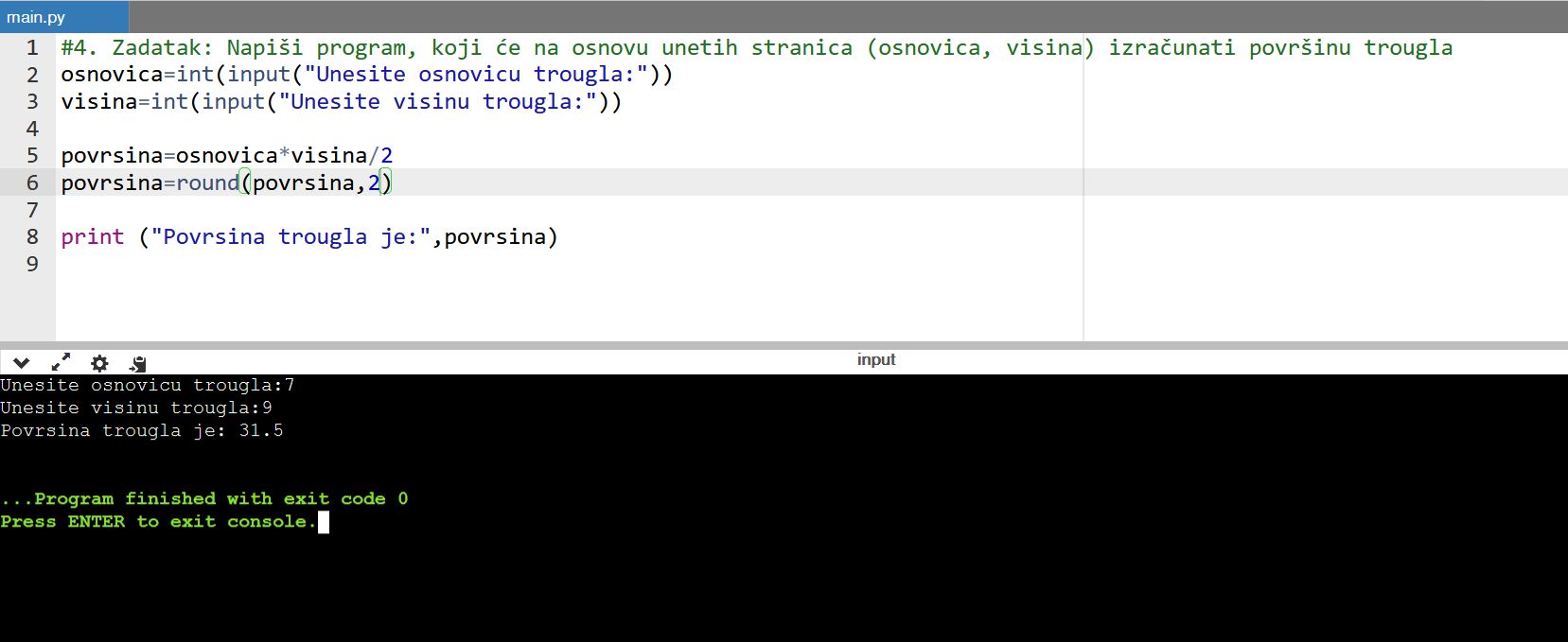 4. zadatak: Napiši program, koji će na osnovu unetih stranica (osnovica, visina) izračunati površinu trougla