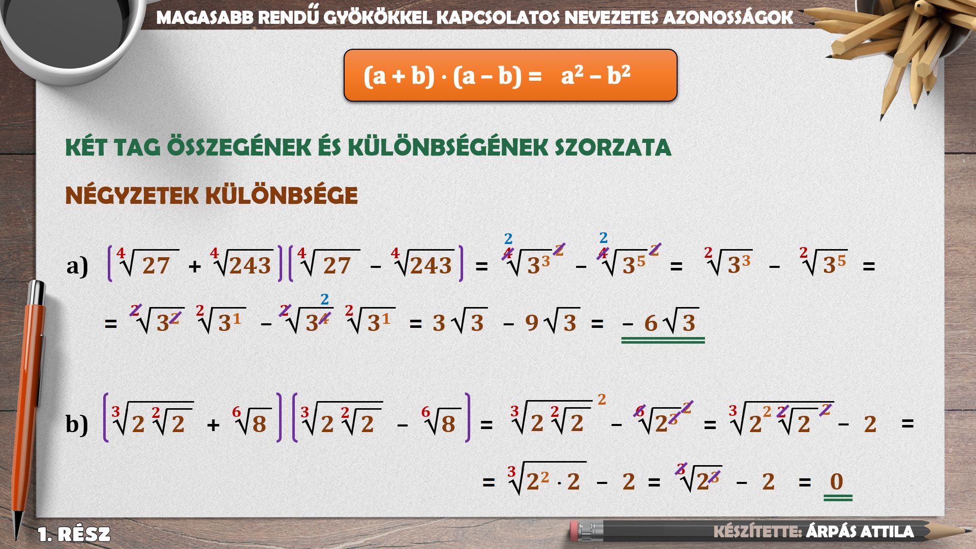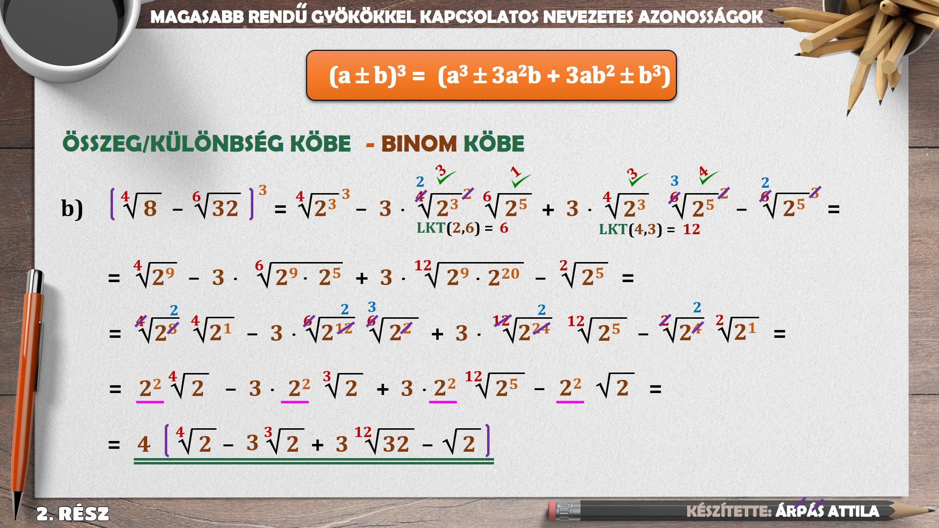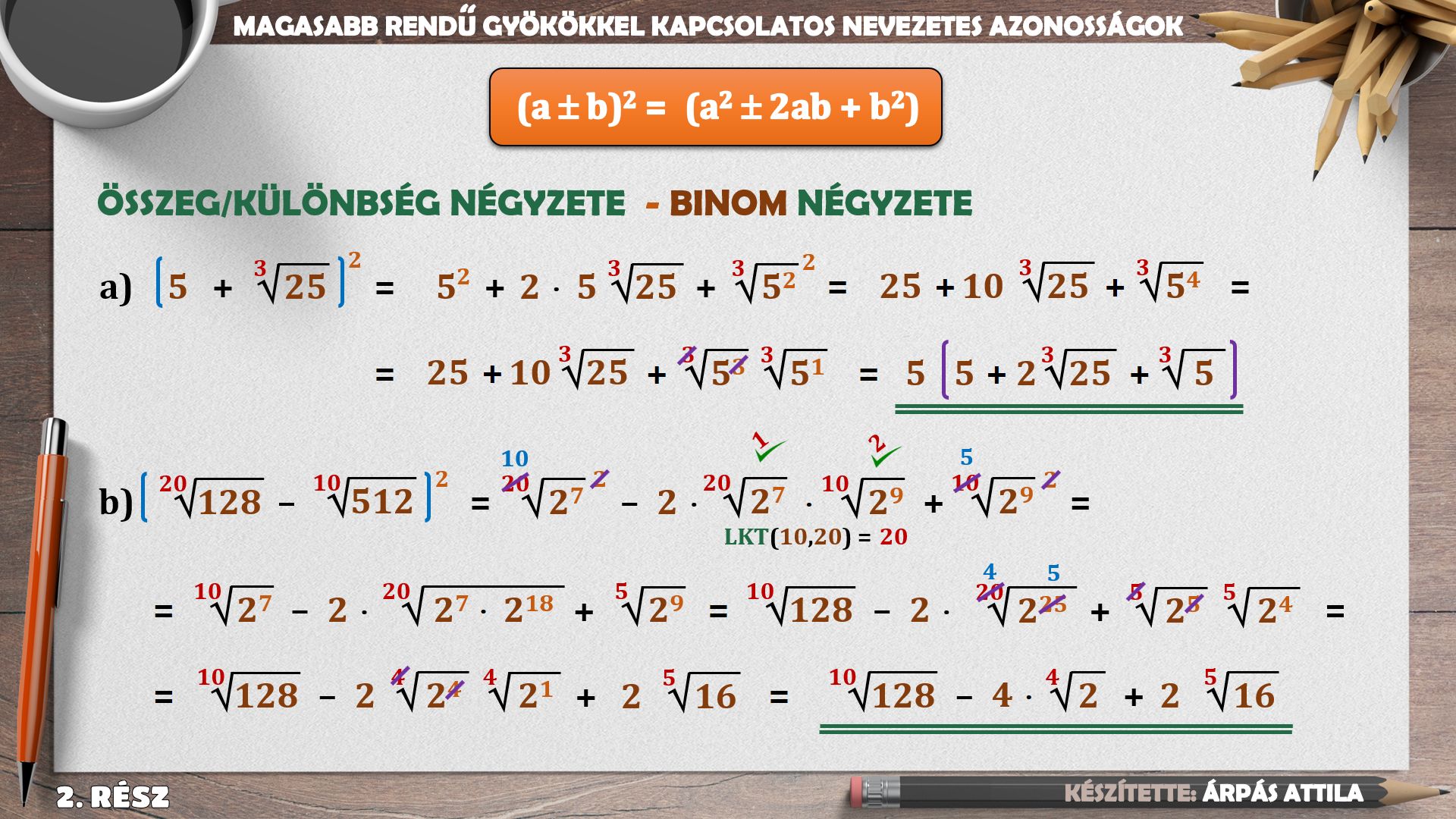 Ebben a leckében magasabb rendű gyököket tartalmazó jellegzetes azonosságokról tanulunk. négyzetek különbsége, köbök összege, köbök különbsége, trinom négyzete. a binom négyzetét, binom köbét gyakoroljuk.