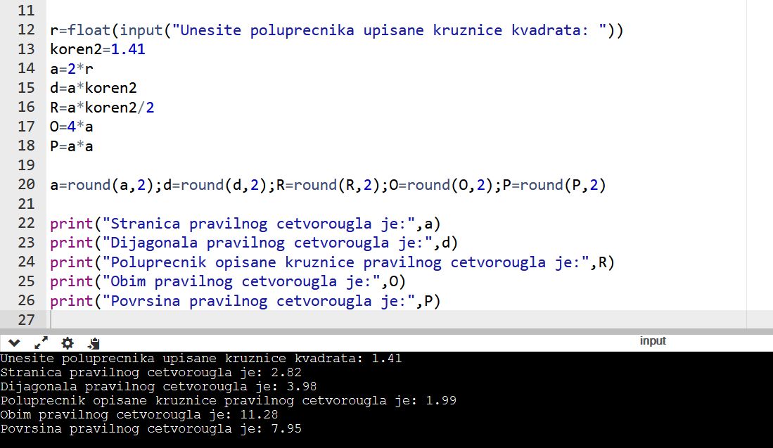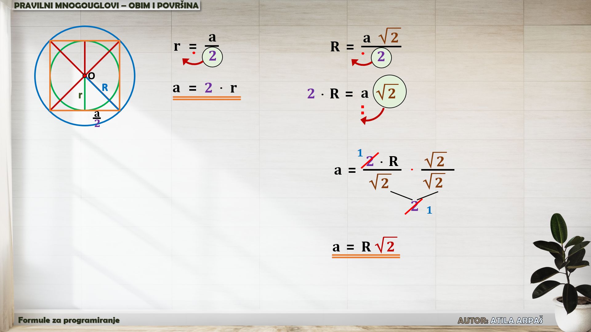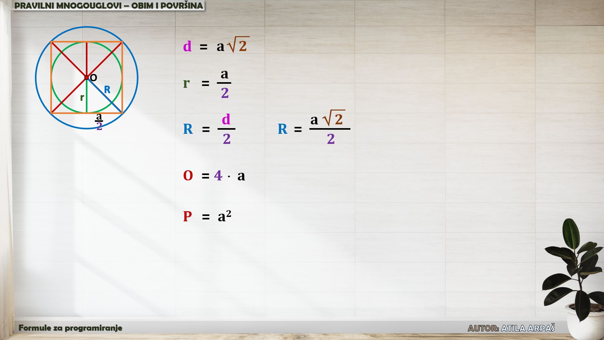 U ovoj lekciji računamo elemente pravilnog četvorougla (dijagonalu, obim, površinu, poluprečnik upisanog i opisanog kruga)