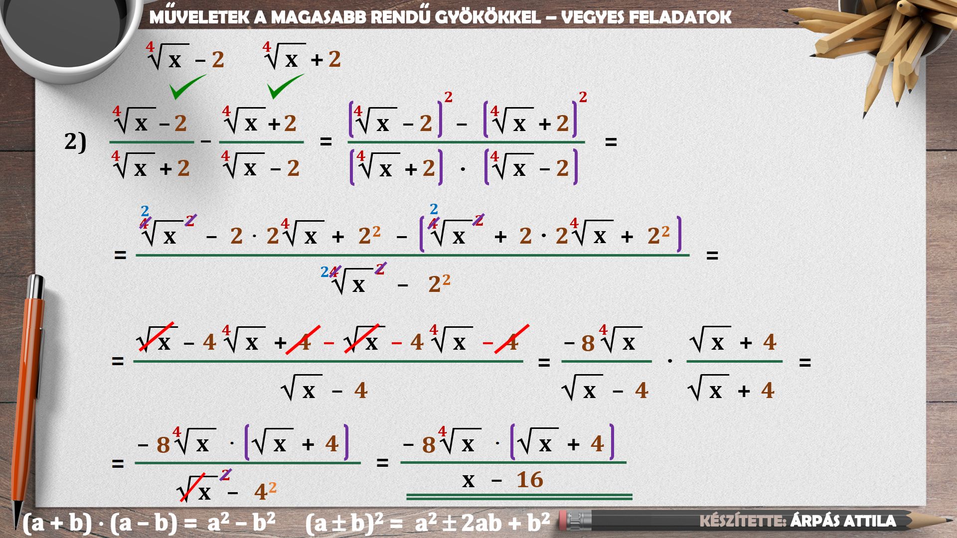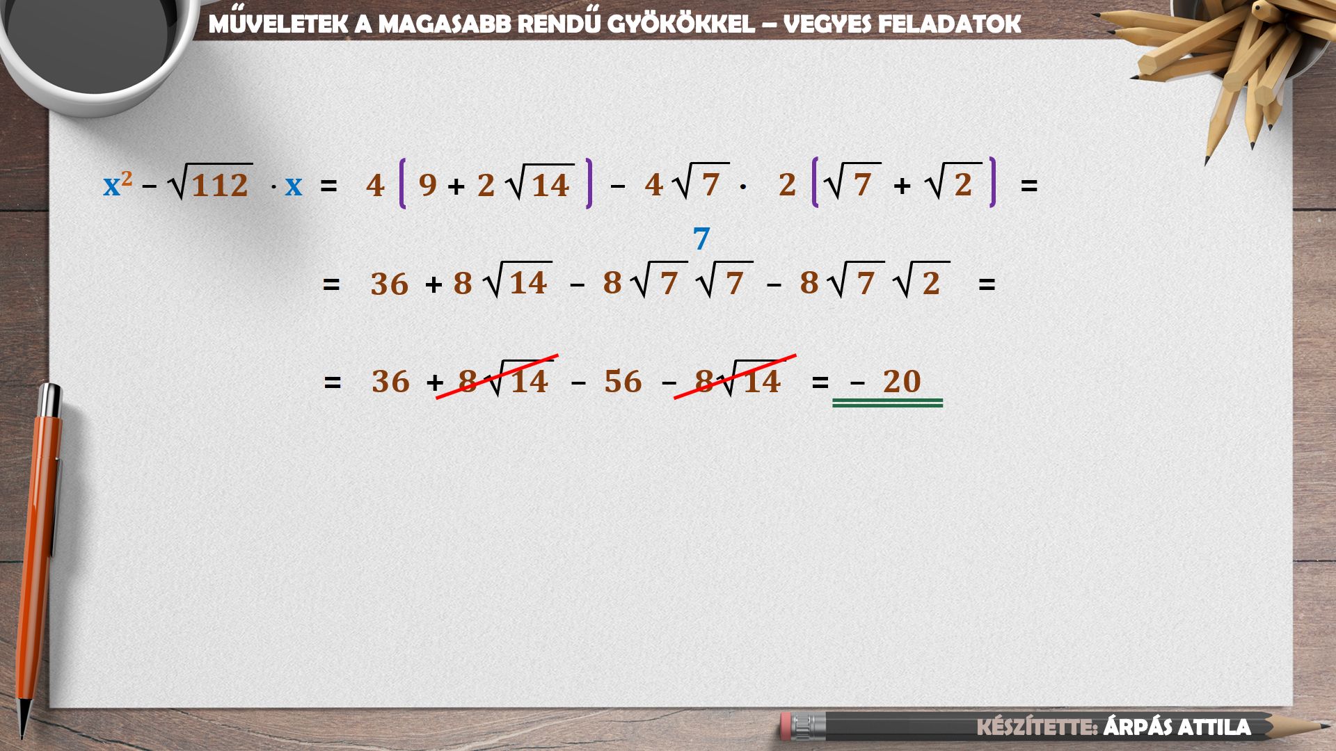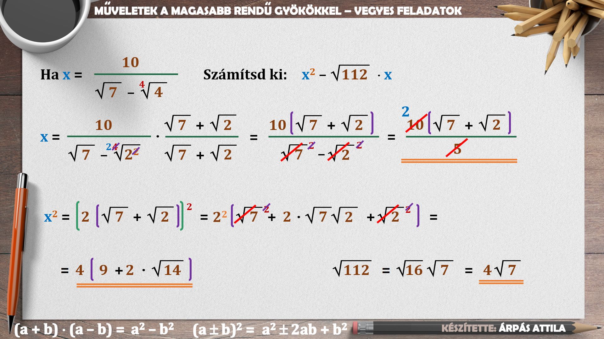 FELADATLAPOK A (MAGASABB RENDŰ) GYÖKÖKKEL TOVÁBBI LECKÉK 1) GYÖKÖK ÖSSZEVONÁSA 2) GYÖKÖK SZORZÁSA ÉS OSZTÁSA 3) GYÖKÖK ÖSSZEVONÁSA, SZORZÁSA, OSZTÁSA 4) MŰVELETEK A GYÖKÖKKEL - NEVEZETES AZONOSSÁGOK ALKALMAZÁSÁVAL 5) MŰVELETEK A GYÖKÖKKEL - ÖSSZETETT FELADATOK 6) MŰVELETEK A GYÖKÖKKEL - ÖSSZETETT FELADATOK |