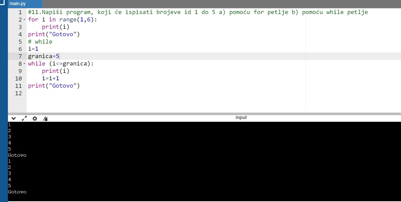 11. zadatak: Napiši program, koji će ispisati brojeve id 1 do 5 a) pomoću for petlje b) pomoću while petlje
