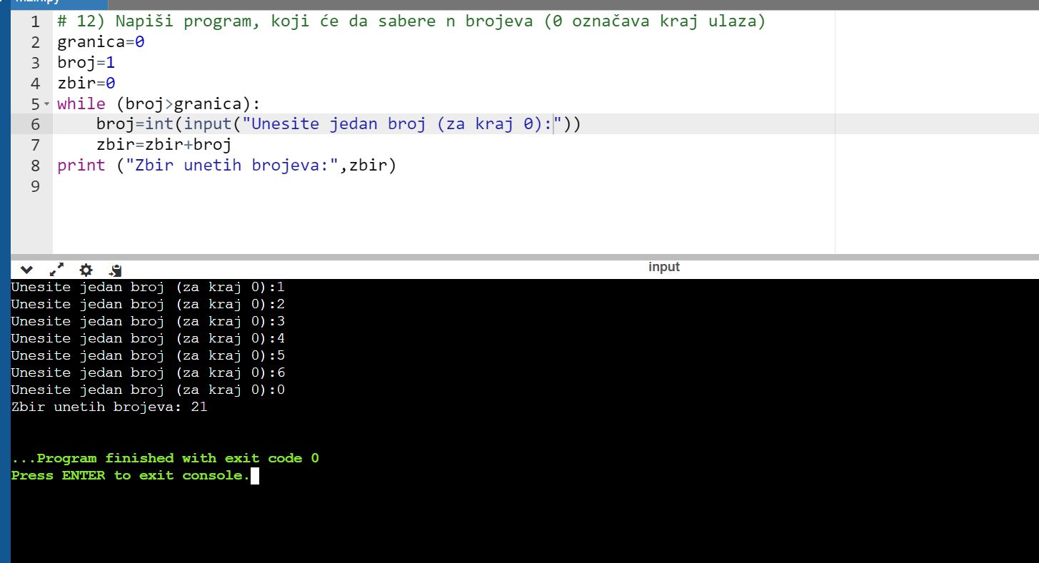12. zadatak: Napiši program, koji će da sabere n brojeva (0 označava kraj ulaza)