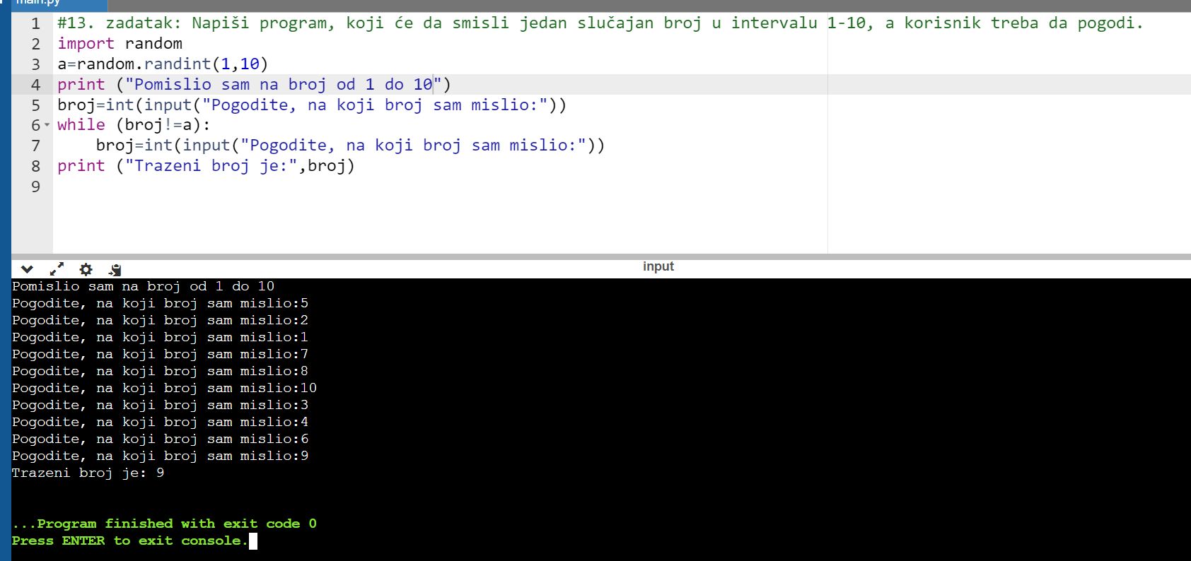 13. zadatak: Napiši program, koji će da smisli jedan slučajan broj u intervalu 1-10, a korisnik treba da pogodi.