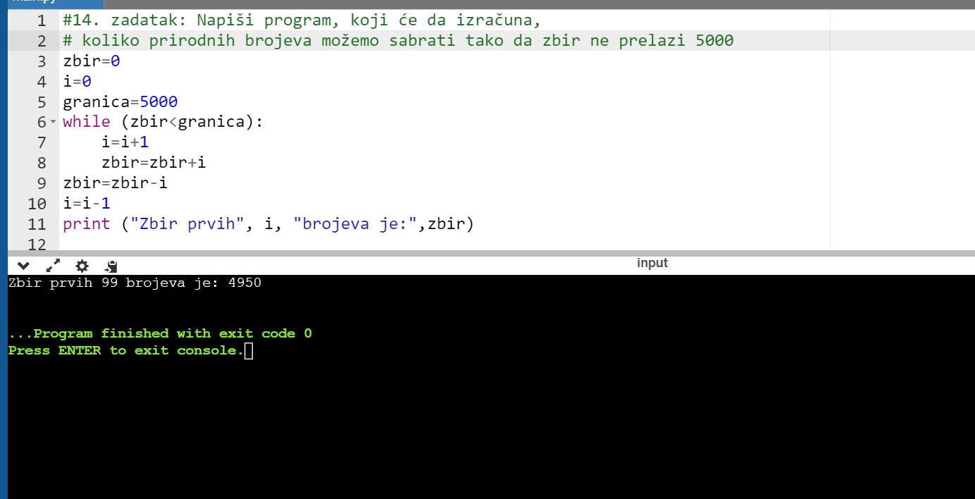 14. zadatak: Napiši program, koji će da izračuna, koliko prirodnih brojeva možemo sabrati tako da zbir ne prelazi 5000