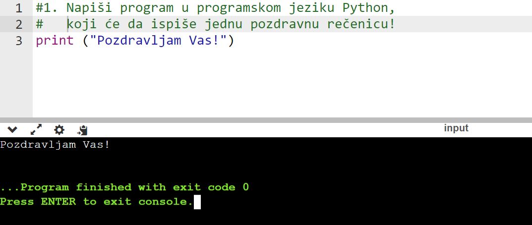 1. zadatak: Napiši program u programskom jeziku Python, koji će da ispiše jednu pozdravnu rečenicu!