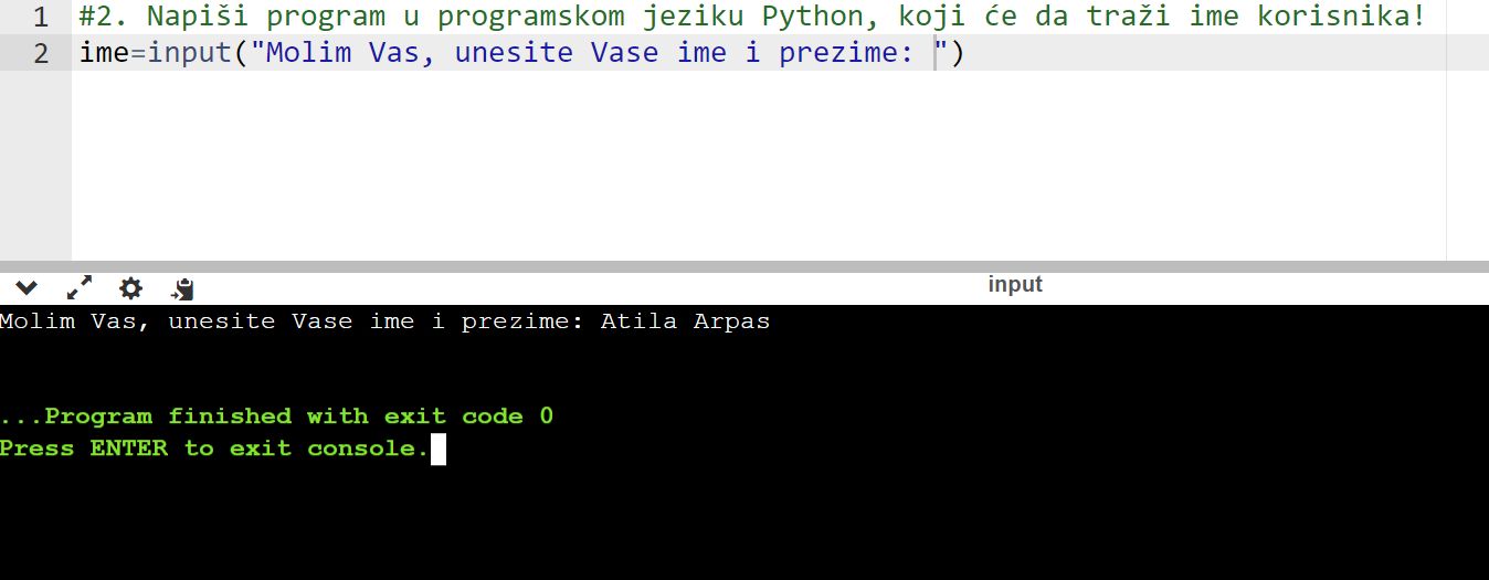 2. zadatak: Napiši program u programskom jeziku Python, koji će da traži ime korisnika!