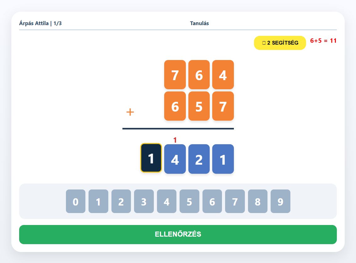 Ez az alkalmazás azért készült, hogy segítse az írásbeli összeadás elsajátítását (is), miközben próbára teszi a gyorsaságot és a pontosságot.