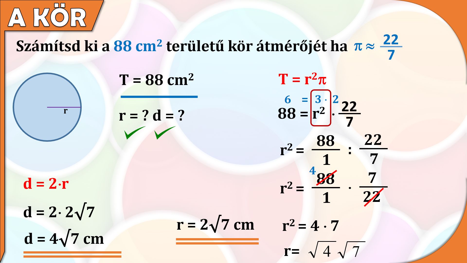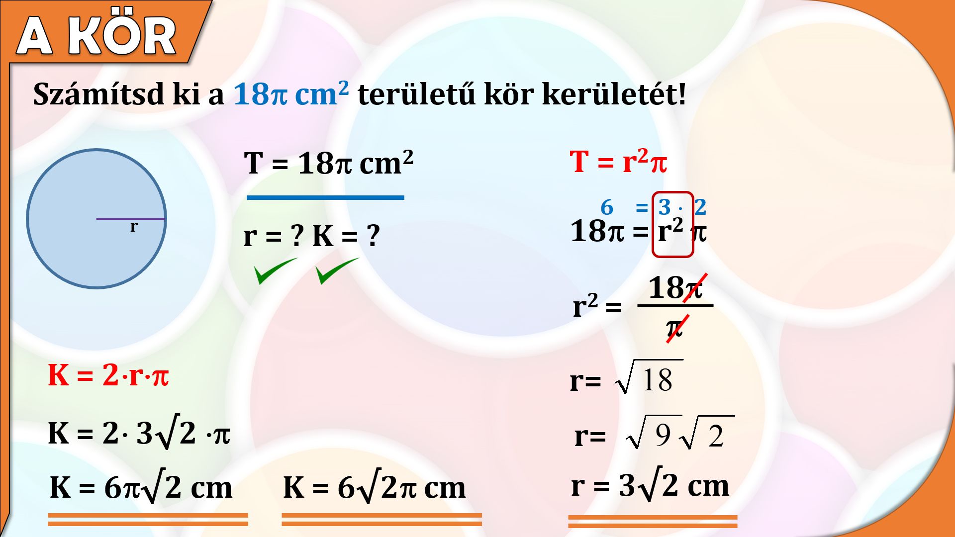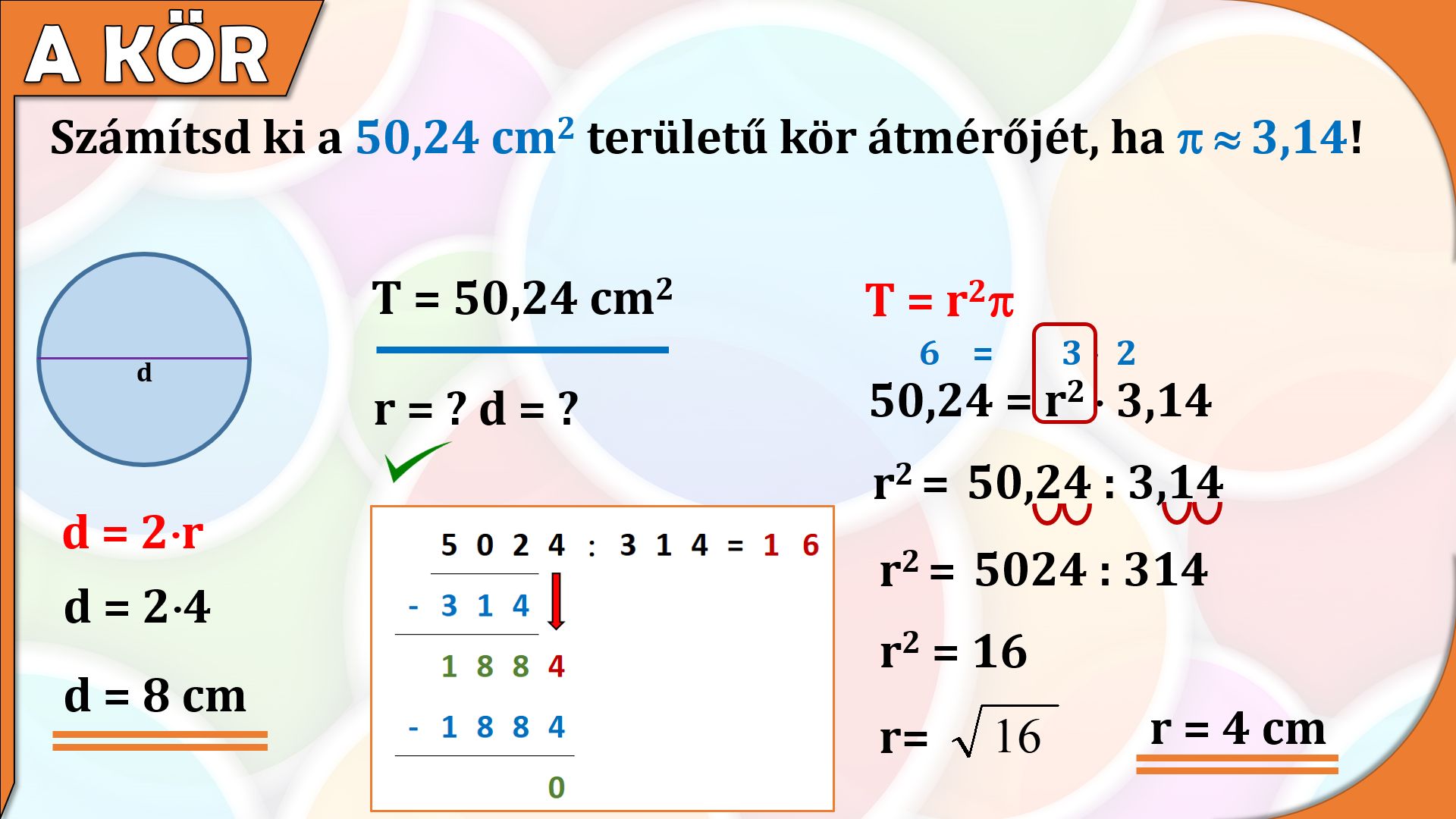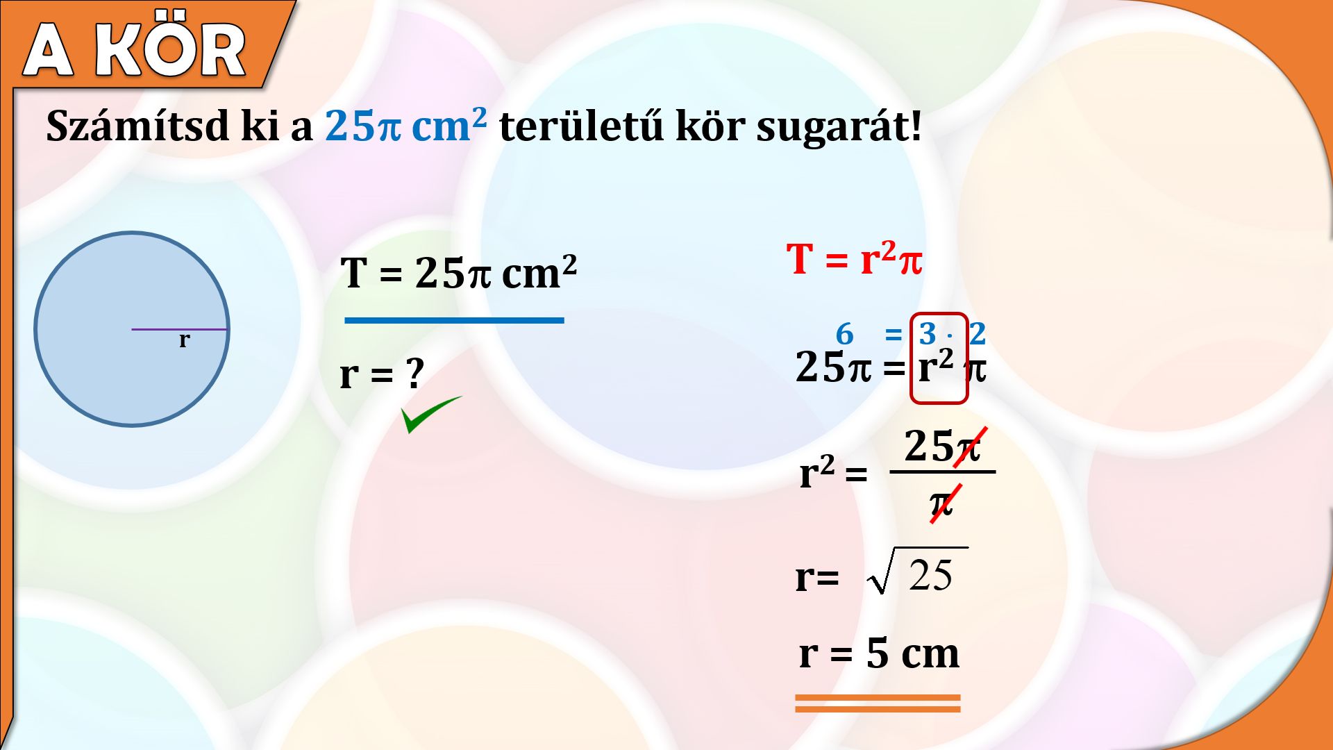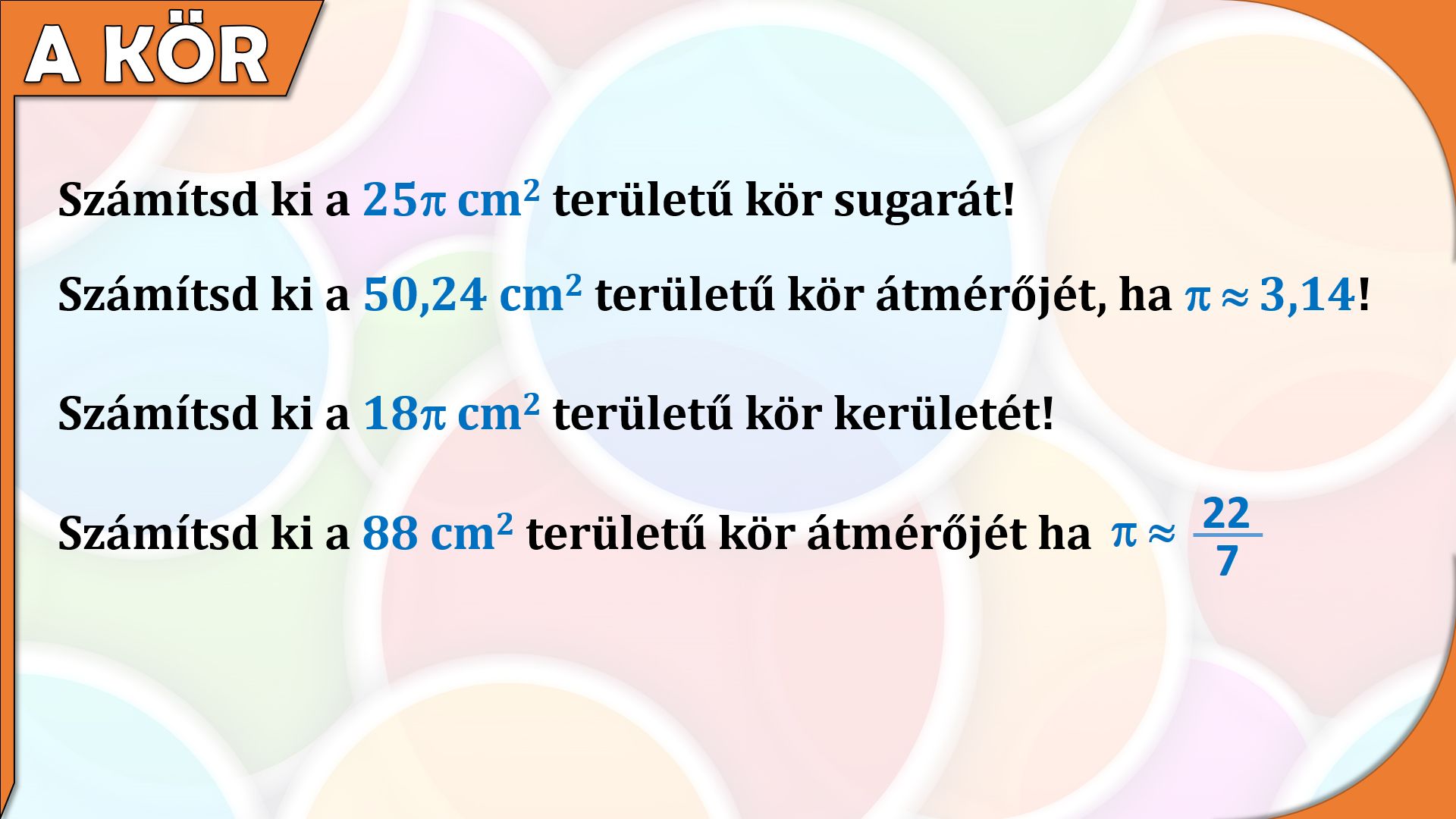 Ebben a leckében a kör területe segítségével számoljuk ki a kör sugarát, átmérőjét, kerületét.