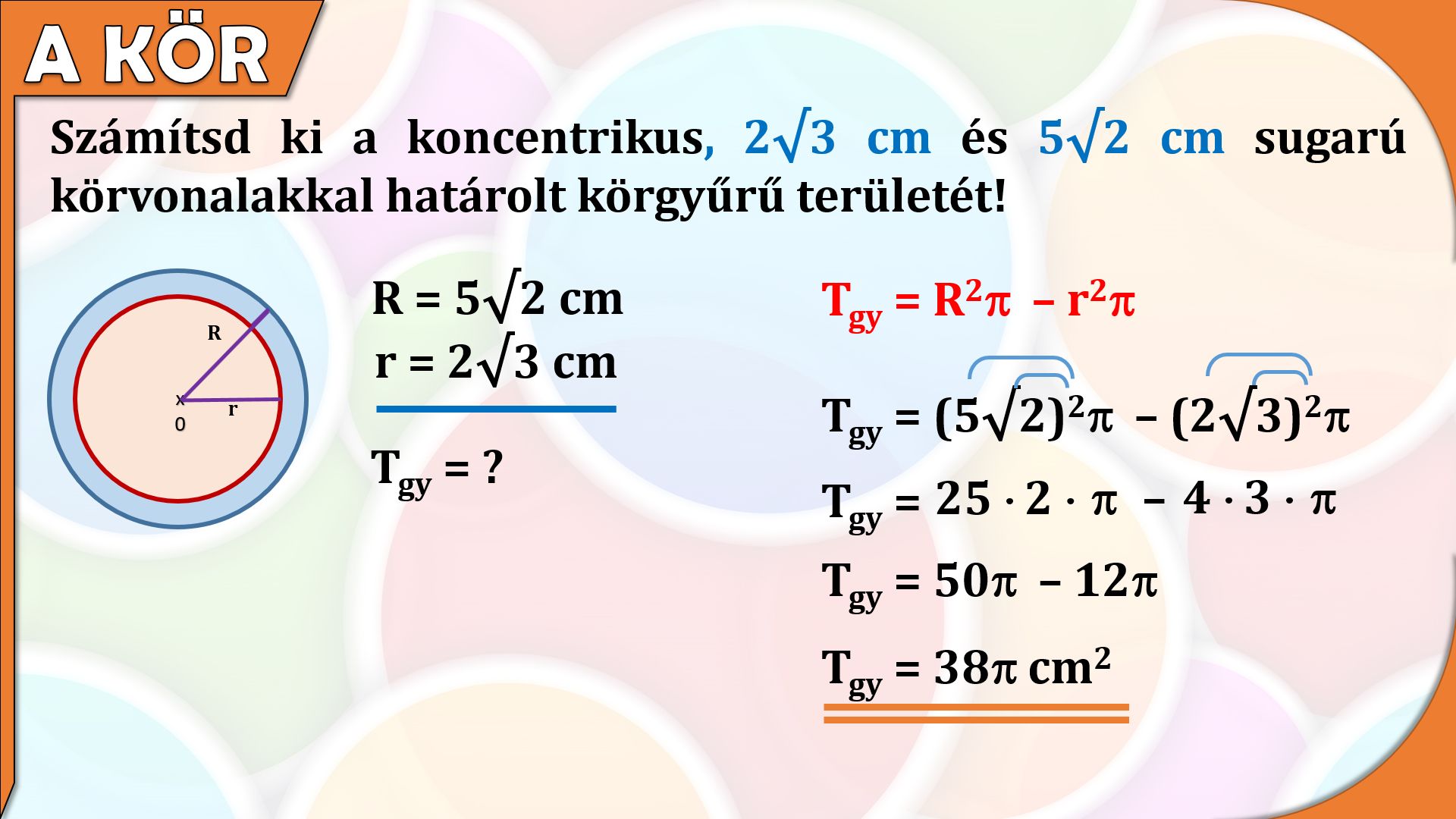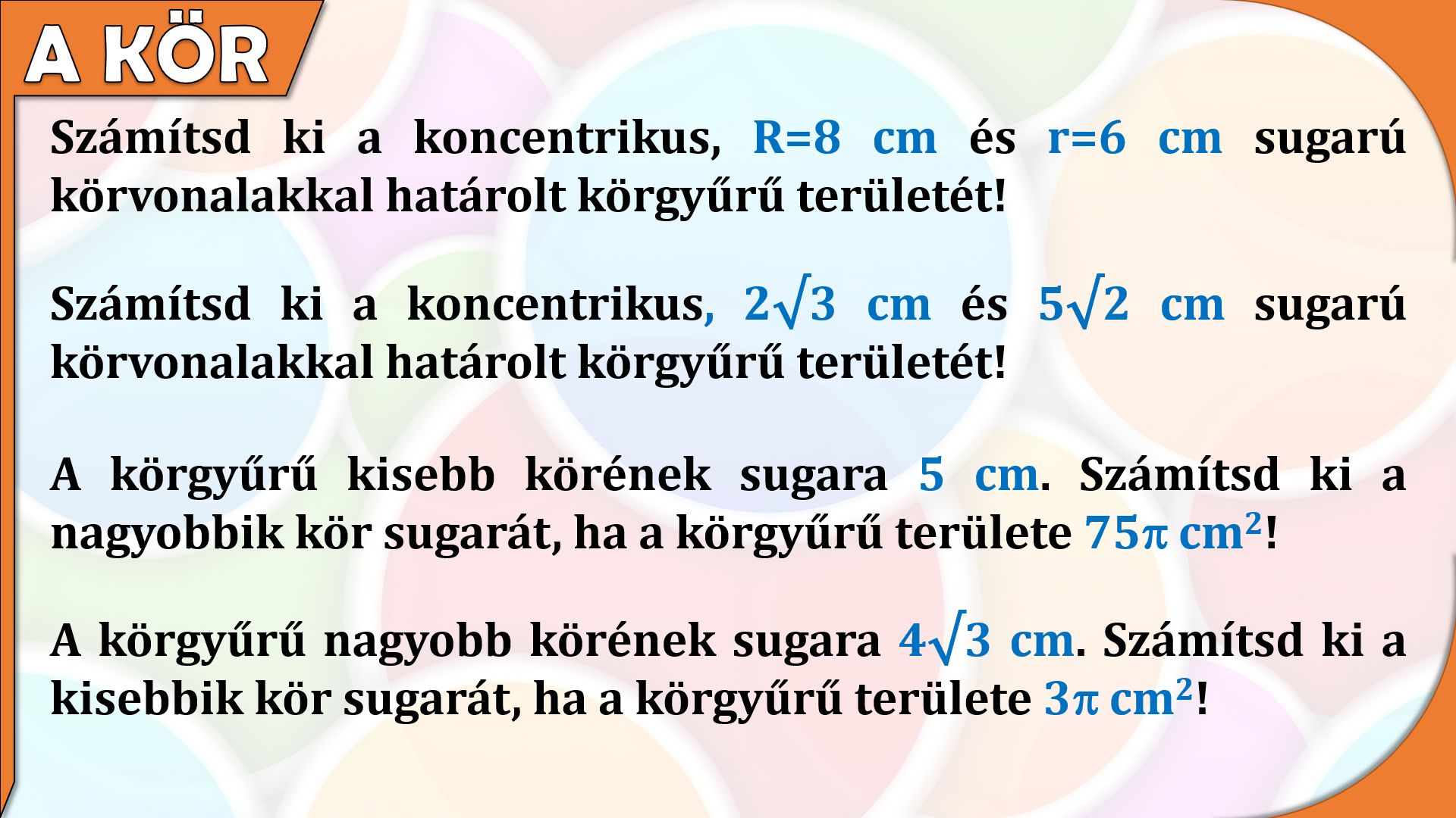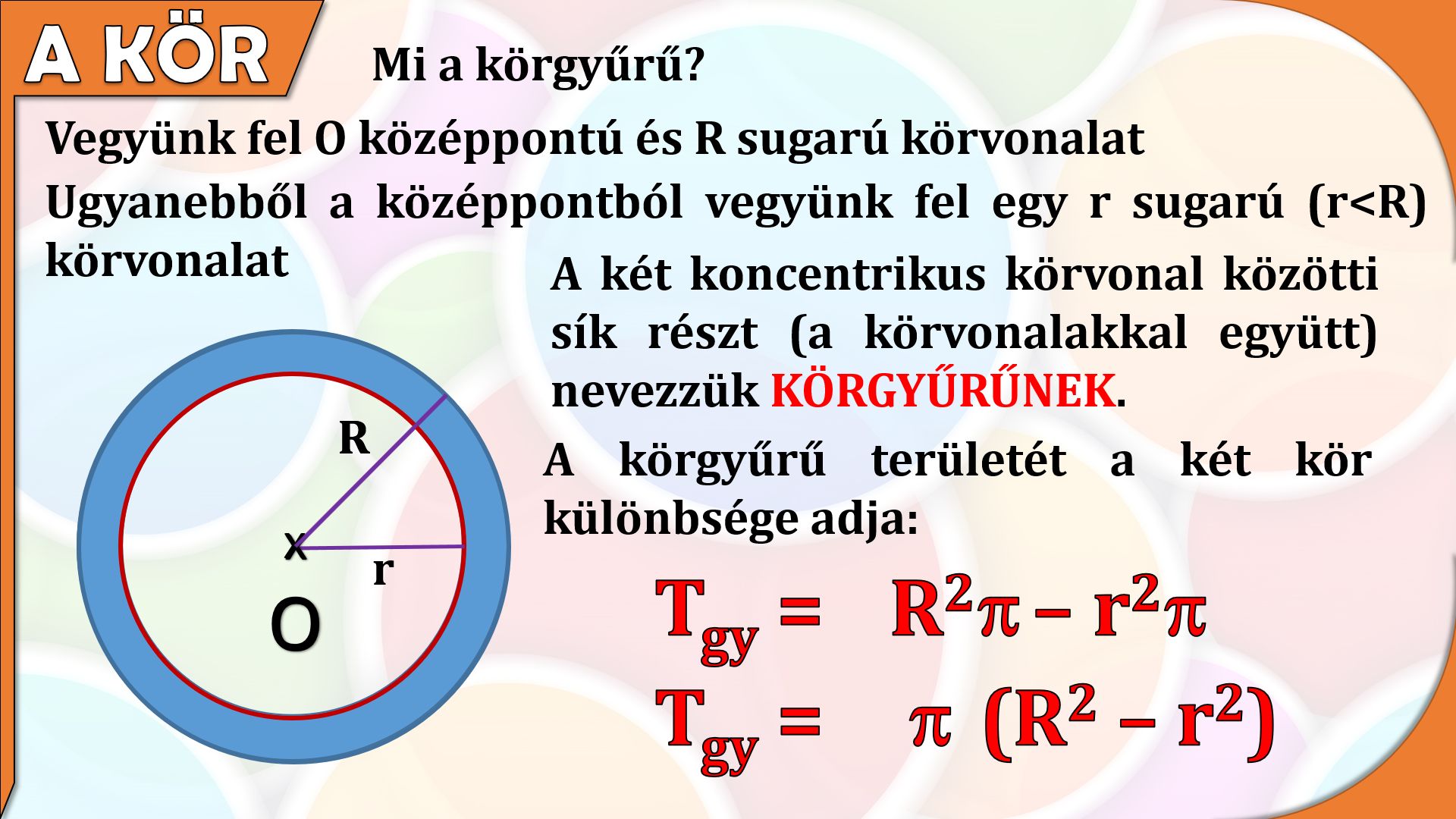 Ebben a leckében megismerkedünk a körgyűrű fogalmával, területének képletével és 4 feladaton gyakoroljuk azt.