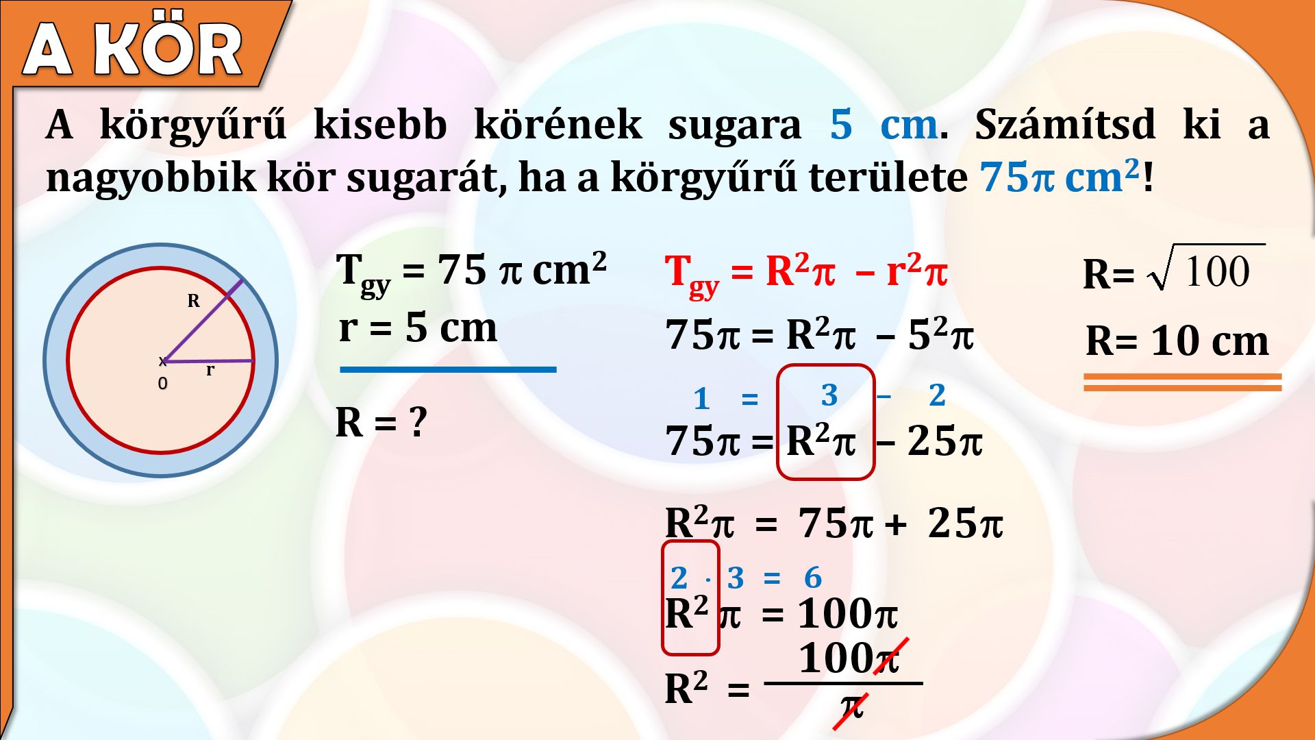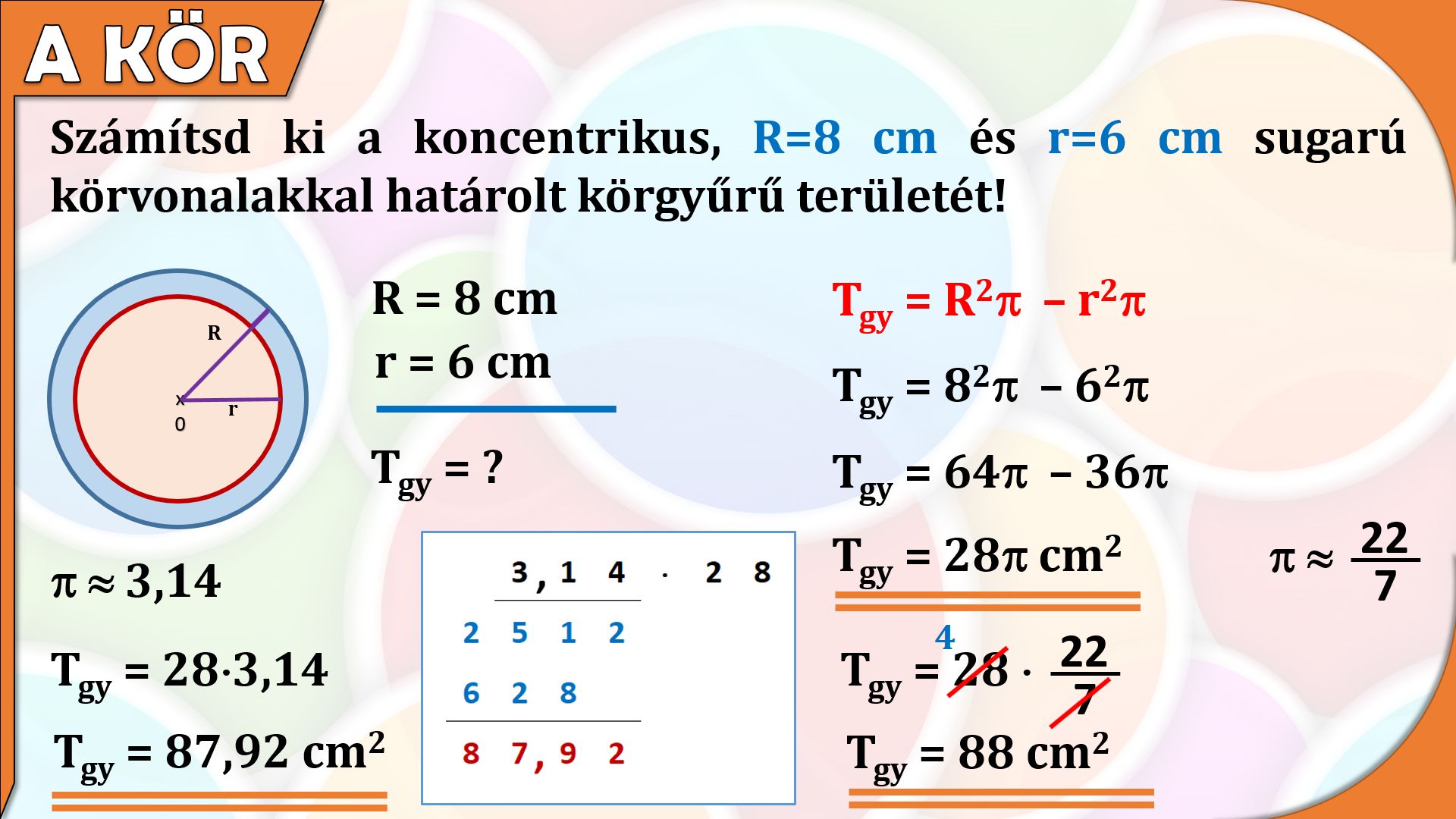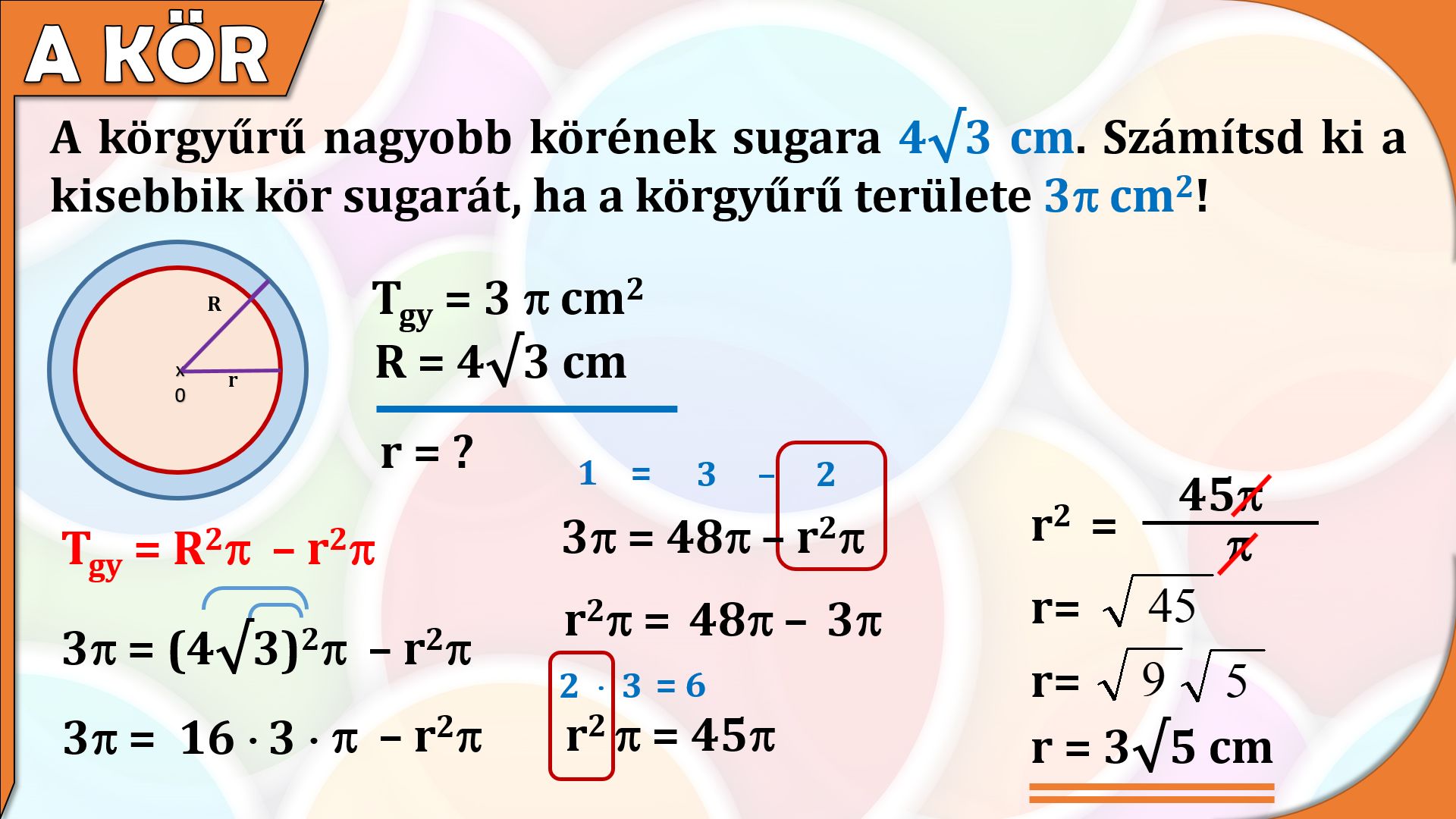 Ebben a leckében megismerkedünk a körgyűrű fogalmával, területének képletével és 4 feladaton gyakoroljuk azt.