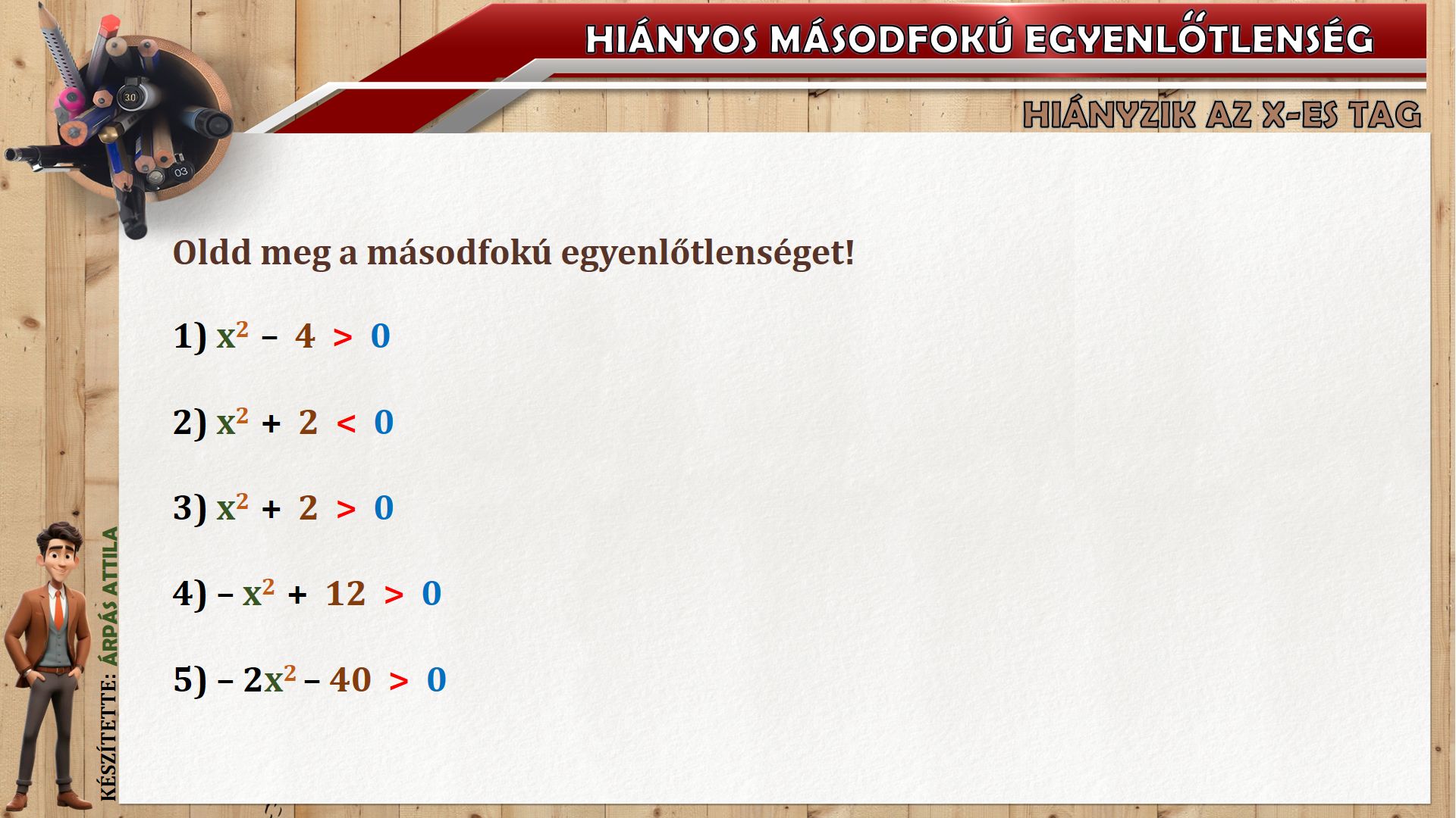 Mai leckénkben hiányos másodfokú egyenlőtlenségek megoldását gyakoroljuk.